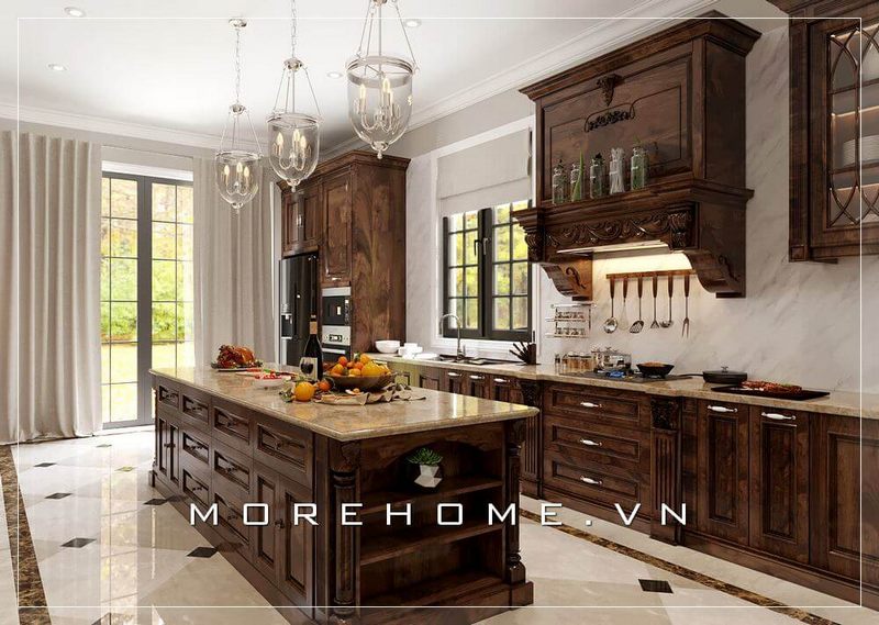 . Tủ bếp gỗ óc chó tự nhiên cao cấp có đường nét hoa văn tân cổ điển được chạm khắc tỉ mỉ, góp phần tạo nên sự tinh tế, tỏa sáng cá tính và đẳng cấp của gia chủ.
